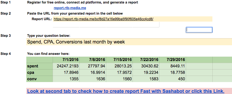 SashaBot is a smart bot for Google docs. Instead of writing complicated formulas to get your real-time data from the advertising platform, just ask SashaBot any question: Like "what was my spend last month" or "Show me Spend, CPA, Conversions for last month by weeks from Facebook." SashaBot will give you a single digit or whole table. Then you can customize it or add a chart. You can also use SashaBot to create custom reports with multiple questions.